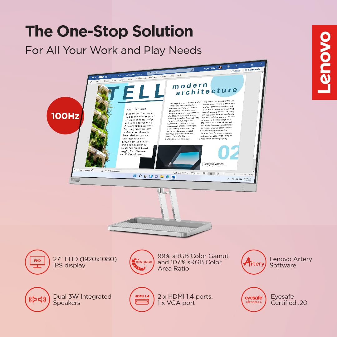 Lenovo L27i-40 68.58cms FHD IPS Ultraslim Monitor| 100Hz, 99% sRGB, 4ms, AMD FreeSync, 2X HDMI 1.4, VGA, 2x3W Speakers, Tilt Stand: Home & Office use, 3 Year Warranty, Cloud Grey, L27i-40