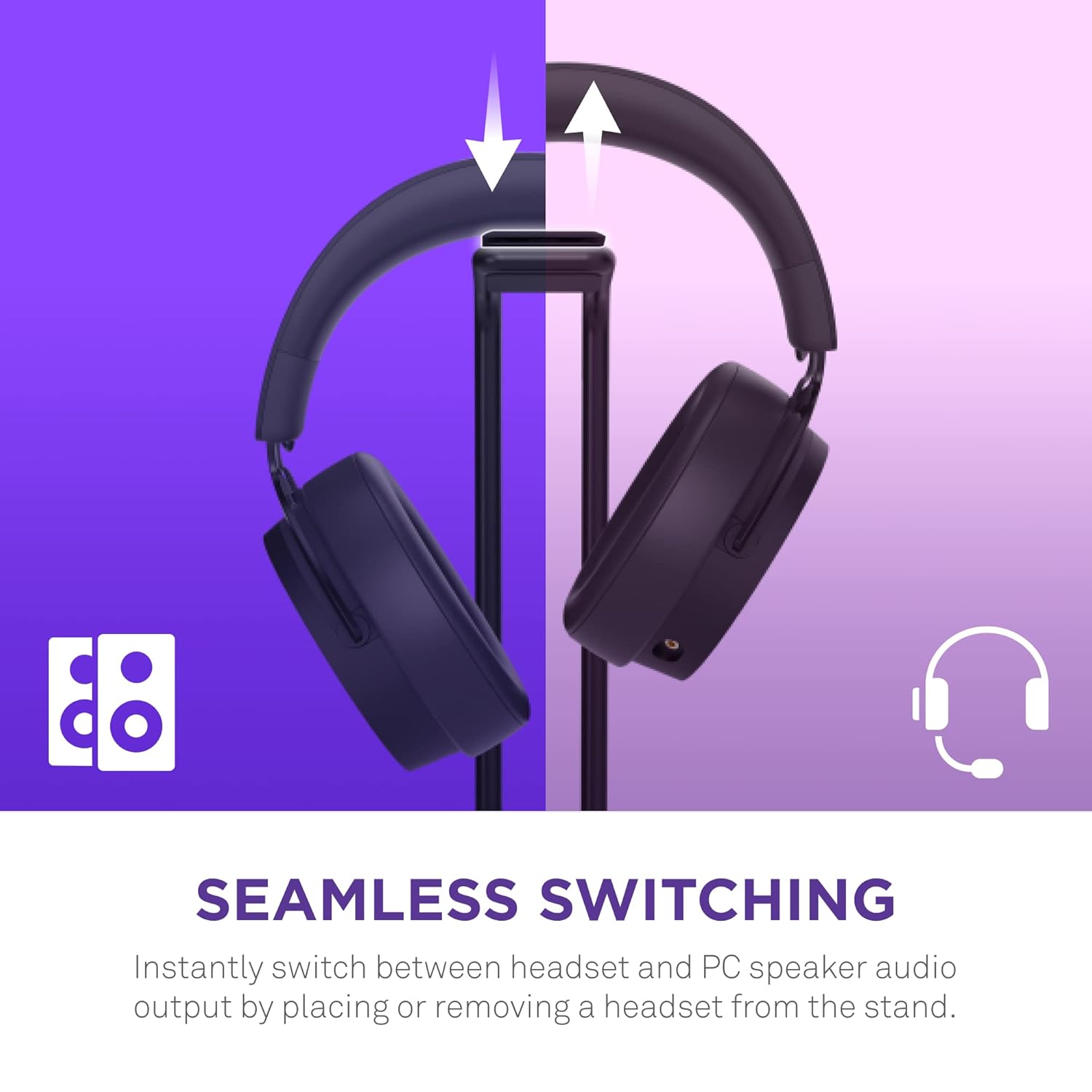 - Instantly switch between headset and speaker audio by simply placing or removing a headset from the pressure-activated button on top of the stand.