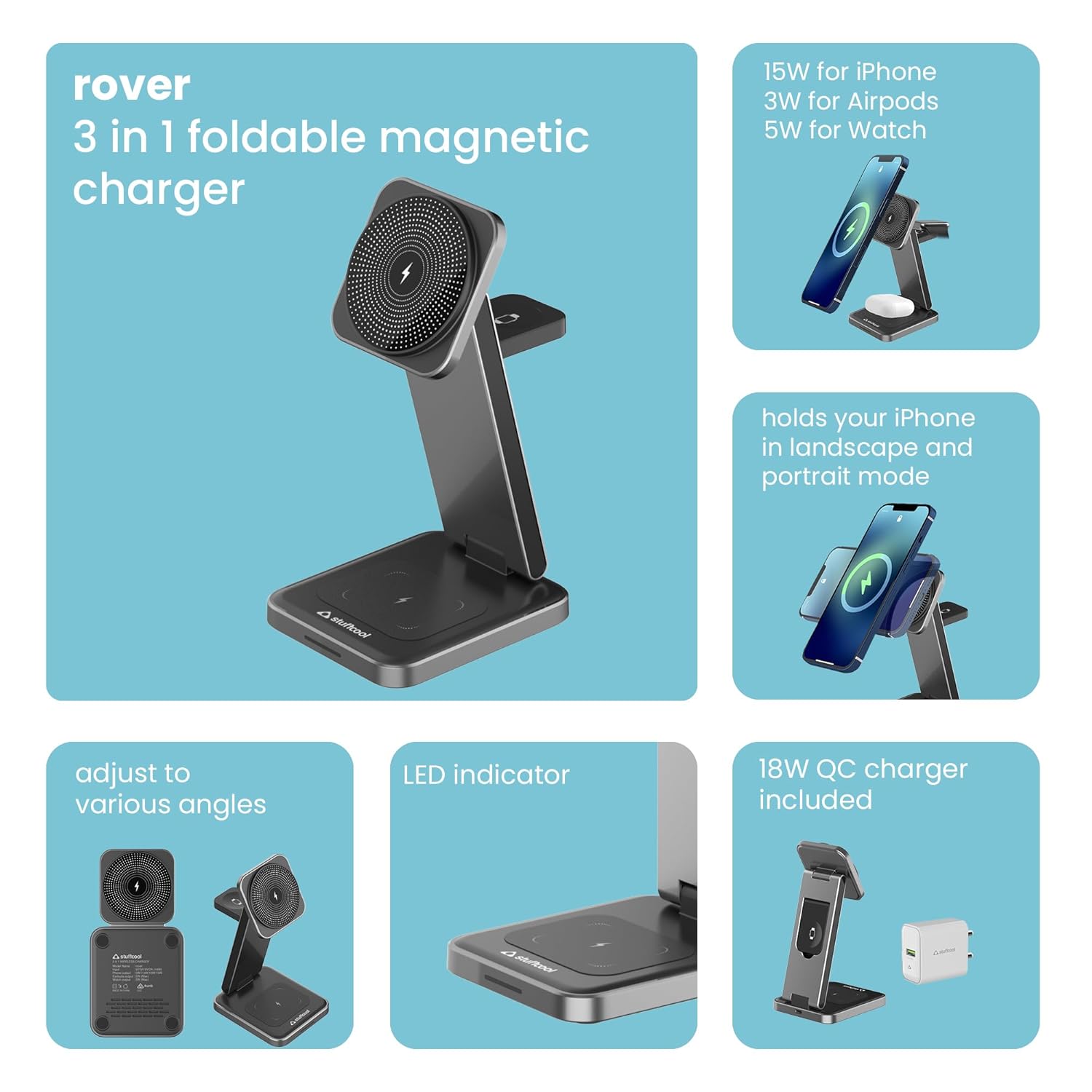 - [A Foldable 3 in 1 Wireless Charging Station from the future]:The Rover is the complete solution to charge your iEssentials such as iPhone, Apple Watch, Airpods. The Rover is made from space grade anodised aluminium and supports magnetic wirelesss charging for iPhone 15/14/13/12 series, comes with a foldable charging module compatible with all Apple watch modules and a wireless charging module for Airpods 3rd gen, AirPods and any other audio products that support wireless charging
